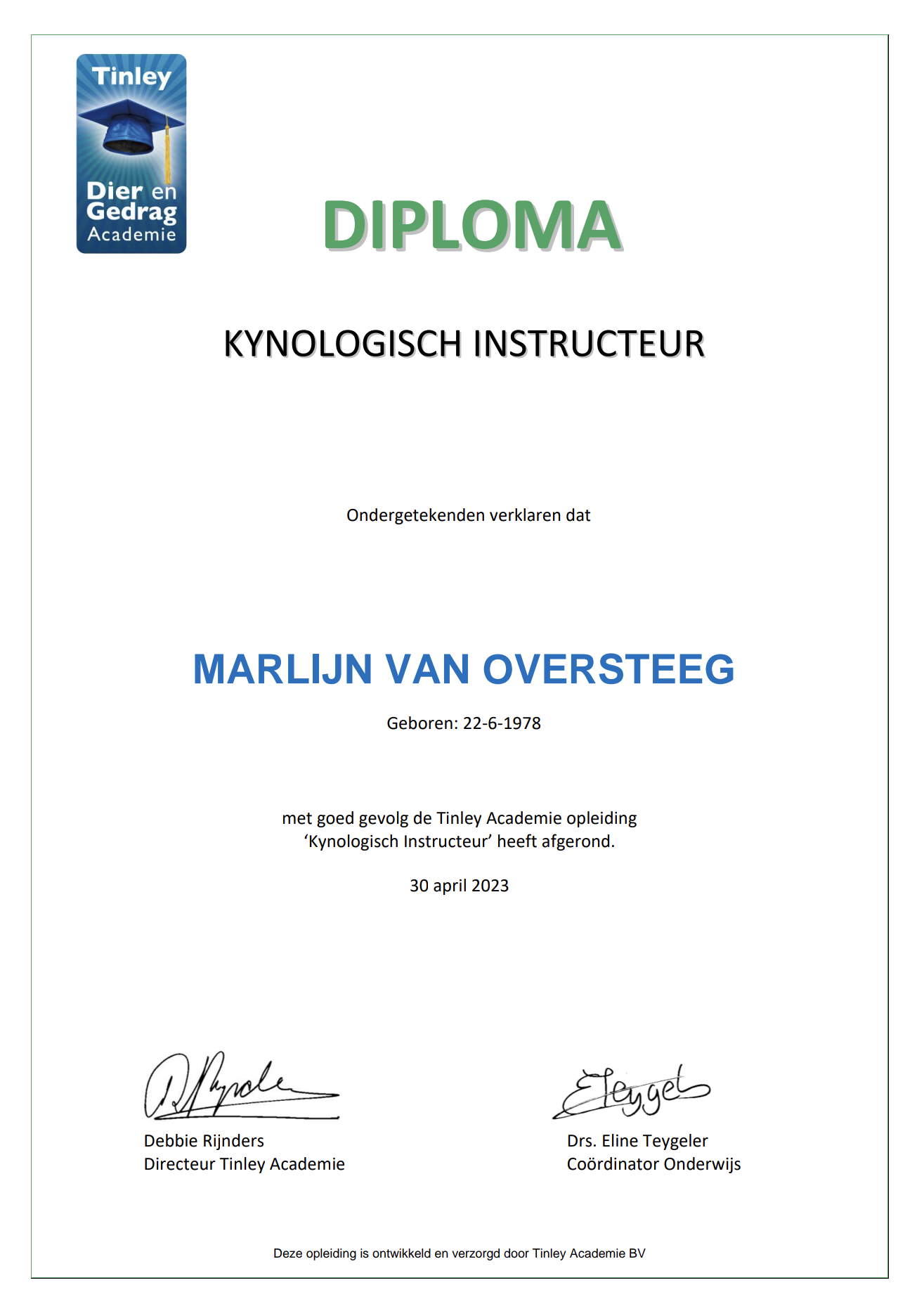 Mijn naam is Marlijn van Oversteeg, hondenprofessional met een passie voor gedrag, training en het welzijn van honden. In 2020 gestart met de hondenuitlaatservice in Deventer wat ik tot september 2025 fulltime heb mogen doen. Tijdens het werk kwam ik er achter dat er meer kennis nodig was. Ik merkte probleempjes op of klanten kwamen met opvoeding gerichte vragen. Ik ben de hondenprofessional en ik wilde mijn groepen en klanten op een juiste manier begeleiden en te woord staan. Daar was kennis voor nodig dus ben ik vele cursussen en opleidingen gaan volgen om hier aan te voldoen. Een blije hond die goed in zijn vel zit, zich veilig voelt en zich sociaal gewenst weet te gedragen is mijn streven. Niet alleen voor het individu maar ook zijn omgeving. Door de vele kennis die ik heb opgedaan door opleidingen, mijn werk en vele observaties is mijn eigen werkwijze ontstaan. Ik kwam er achter dat mijn werkwijze goed werkt en dat ik het duidelijk en onderbouwd kan doorgeven aan de eigenaar. Het is vooral een combinatie van spel, elementen van Look At That, Look At Me en BAT en zeer zeker ook van tijdig begrenzen van gedrag wat over gaat in ongewenst gedrag. Hierbij wordt aan de onderliggende motivatie of emotie (zoals angst of pijn) van de hond niet voorbij gegaan.